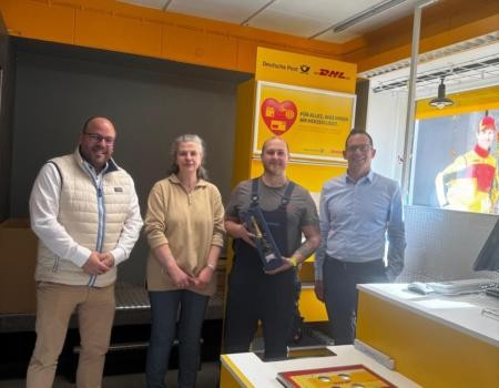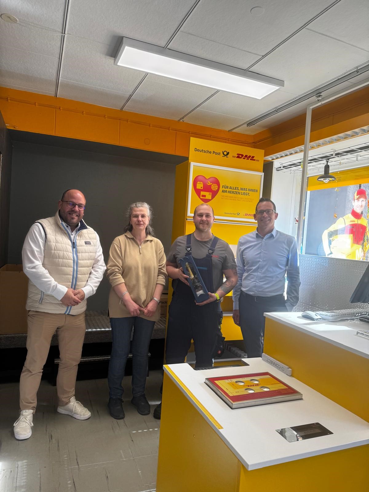 Bildunterschrift: von links Ralf Nocke, Vetriebsmanager Deutsche Post AG, Veronika Kleiser, Mitarbeiterin Manuel Kleiser, Inhaber Schlosserei Kleiser und Bürgermeister Heiko Wehrle.
