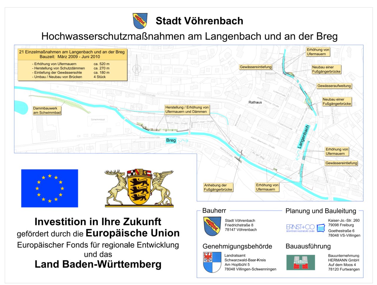 In Vöhrenbach wurden vom Frühjahr 2009 bis Juni 2012 umfangreiche Bauarbeiten für den Hochwasserschutz an der Breg und am Langenbach durchgeführt. Mit zahlreichen Einzelmaßnahmen werden an verschiedenen Stellen z. B. Ufermauern erhöht, Gewässersohlen vertieft, Aufweitungen vorgenommen und Brücken erneuert, um das Stadtgebiet vor einem 100-jährigen Hochwasser zu schützen.Die Hochwasserschutzmaßnahmen wurden vom Land Baden-Württemberg und der EU aus dem Europäischen Fonds für regionale Entwicklung (EFRE) gefördert. Die Baukosten betrugen knapp 1,5 Mio. Euro und die Höhe der Zuschüsse insgesamt 837.000 Euro.Den Übersichtsplan mit einzelnen Maßnahmen finden Sie unten.
