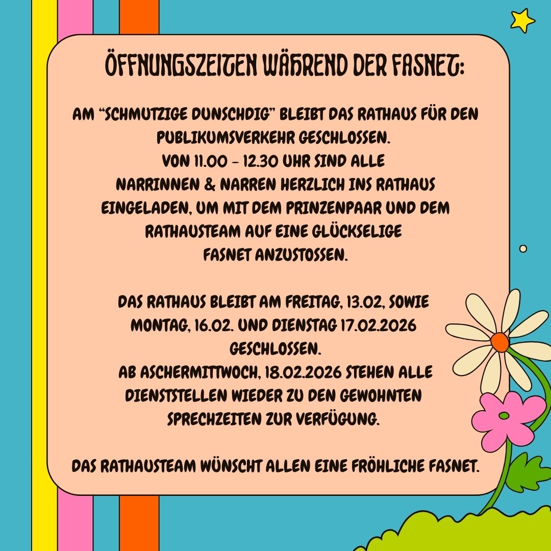 Ab Aschermittwoch, 18.02.2026 stehen alle Dienststellen wieder zu den gewohnten Sprechzeiten zur Verfügung.